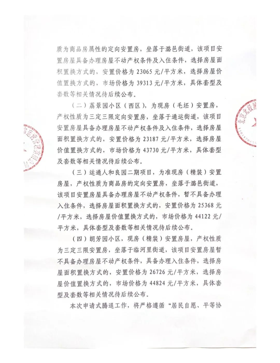(三)運通人和良園二期項目,為準現(xiàn)房(精裝)安置房屋,產(chǎn)權(quán)性質(zhì)為商品房的定向安置房,坐落于潞邑街道,該項目安置房屋具備辦理房屋不動產(chǎn)權(quán)條件,暫不具備辦理入住條件,選擇房屋面積置換方式的,安置價格為25368元/平方米,選擇房屋價值置換方式的,市場價格為 44122 元/平方米,具體套型及套數(shù)等相關(guān)情況待后續(xù)公布。