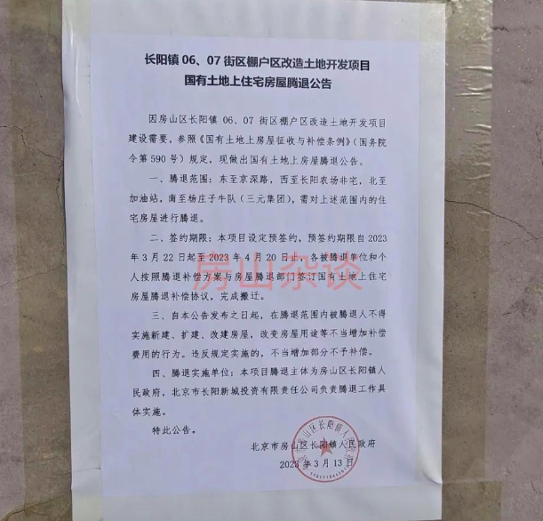 因房山區長陽鎮 06、07 街區棚戶區改造士地開發項目建設需要,參照《國有土地上房屋征收與補償條例》《國務院令第 590號)規定,現做出國有土地上房屋騰退公告。