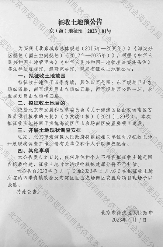 征收土地預公告(京(海)地征預〔2023〕01號) 海淀區巨山農場南區安置房項目