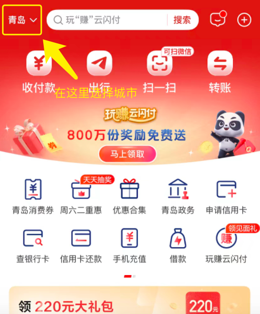 首先下載登錄云閃付App。如果你本人不在青島,請先在云閃付App首頁把所在城市改為青島,否則領券界面不能顯示。