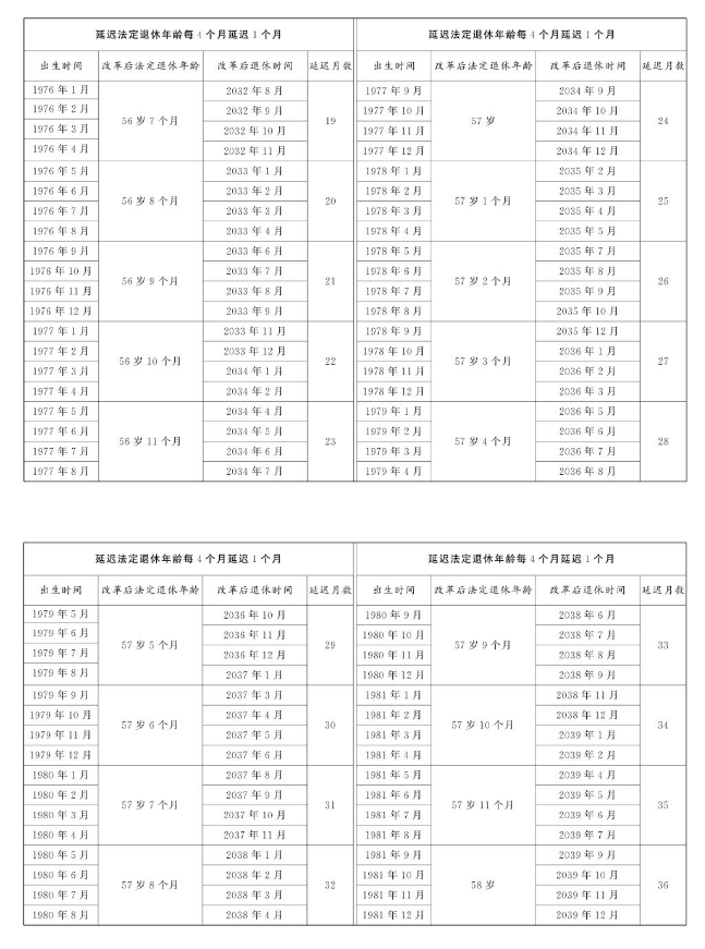 第一條?從2025年1月1日起,男職工和原法定退休年齡為五十五周歲的女職工,法定退休年齡每四個月延遲一個月,分別逐步延遲至六十三周歲和五十八周歲;原法定退休年齡為五十周歲的女職工,法定退休年齡每二個月延遲一個月,逐步延遲至五十五周歲。國家另有規定的,從其規定。