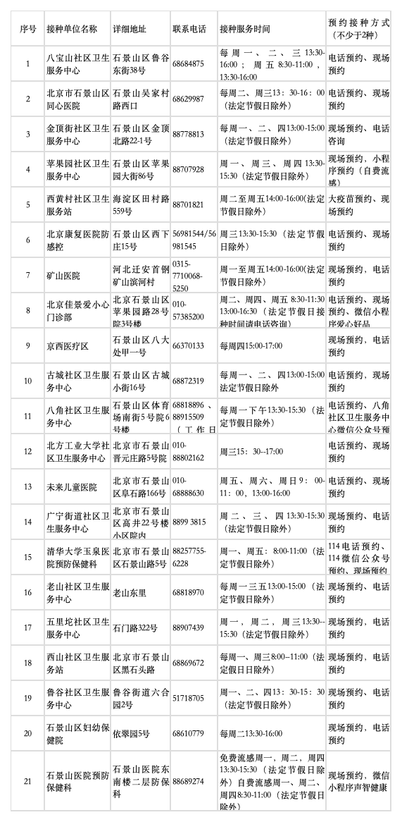 北京石景山區流感疫苗接種門診服務時間公示來了,具體事宜可咨詢接種門診